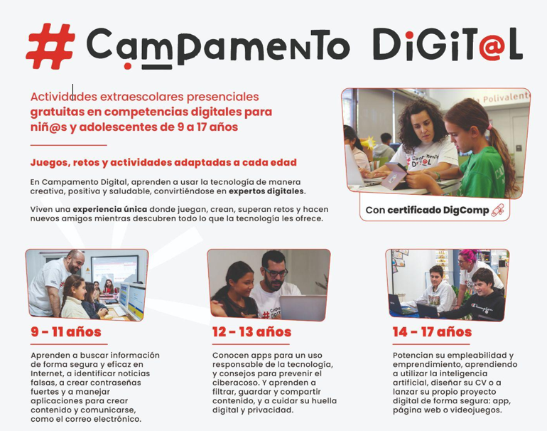 - Para los jóvenes de 14 a 17 años, Campamento Digital se convierte en un espacio de exploración y proyección de futuro. En esta etapa se trabajan temas como la creación de un currículum digital, el emprendimiento online, el desarrollo de contenido para redes sociales, la inteligencia artificial, la programación y la ciberseguridad.