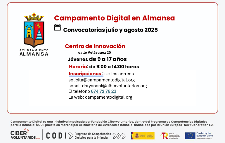 Fundación Cibervoluntarios y el Ayuntamiento de Almansa se han unido con el objetivo común de activar y potenciar el talento digital de jóvenes almanseños a través de Campamento Digital, una actividad, presencial y gratuita, de formación en competencias digitales para niños y niñas de 9 a 17 años, que se llevará a cabo en junio, julio y agosto en el Centro de Innovación y Formación Aniceto Coloma en la calle Velázquez 25.