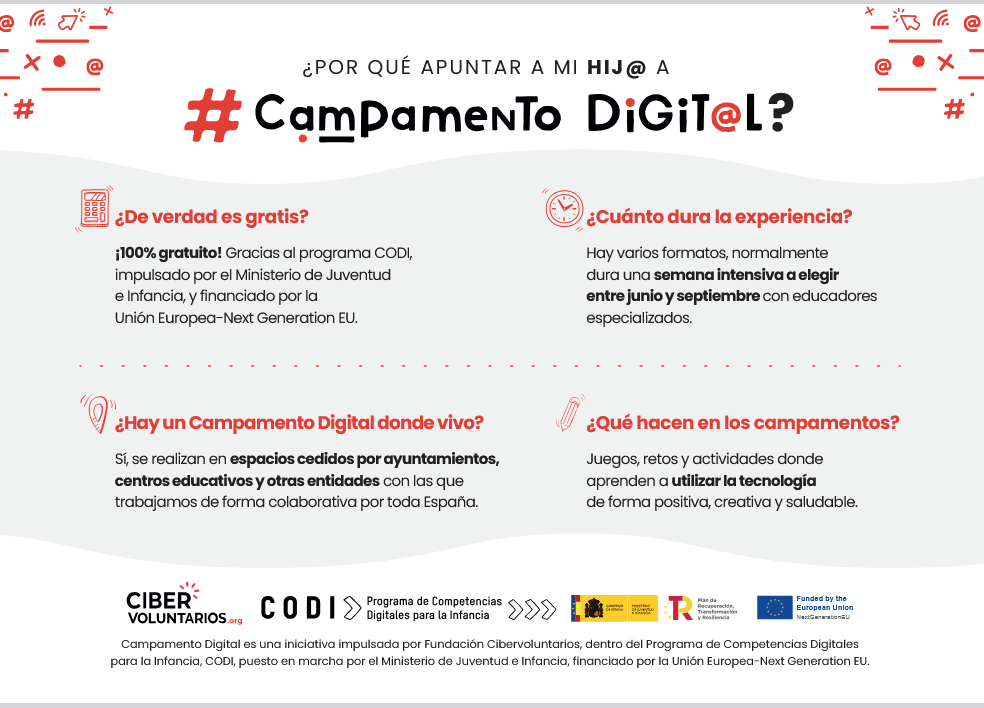 Campamento Digital es una iniciativa impulsada por Fundación Cibervoluntarios, dentro del Programa de Competencias Digitales para la Infancia, CODI, puesto en marcha por el Ministerio de Juventud e Infancia, financiado por la Unión Europea-Next Generation EU.