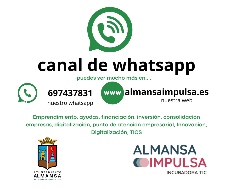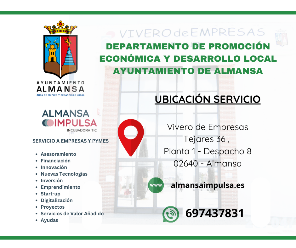 Desde el Departamento de Promoción Económica y Desarrollo Local del Ayuntamiento de Almansa, trabajamos de forma continua para facilitar la creación, desarrollo, consolidación e innovación del tejido empresarial local. Nuestra labor se articula a través de ALMANSA IMPULSA – Incubadora TIC, un espacio de asesoramiento, acompañamiento y recursos dirigidos a personas emprendedoras, trabajadores autónomos, pymes y nuevos proyectos empresariales.