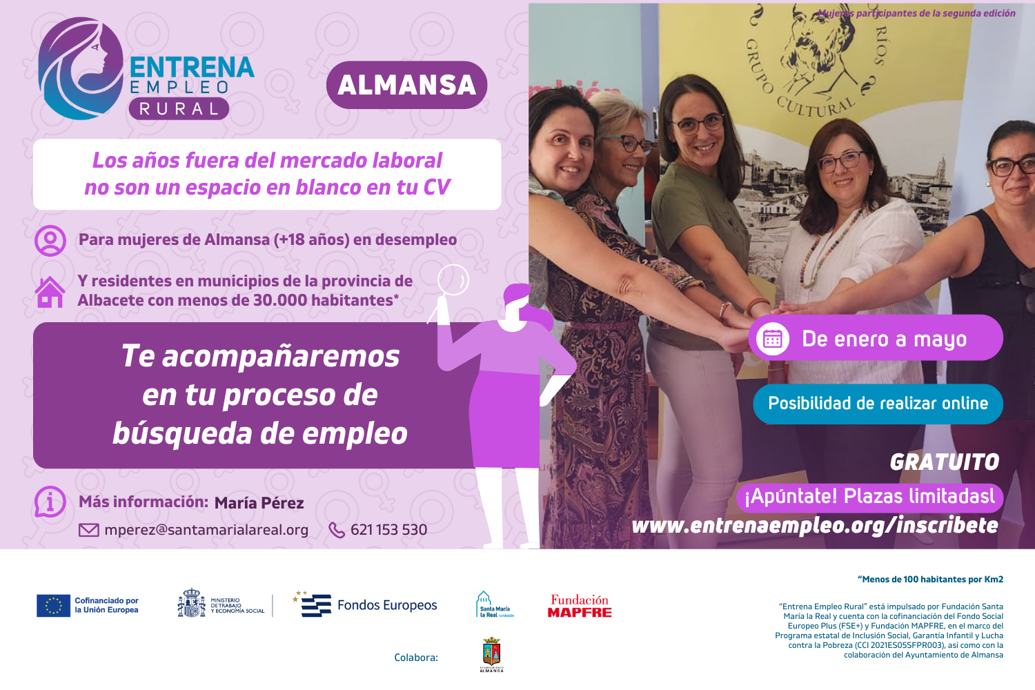 “Entrena Empleo Rural” es el programa gratuito de orientación laboral que guía a mujeres en desempleo en diferentes municipios de menos de 30.000 habitantes* de España a reactivar su búsqueda de trabajo con nuevas técnicas y herramientas digitales para fomentar su inserción. A partir de enero se pondrá en marcha una nueva edición en diferentes puntos de España, entre ellos Almansa (Albacete).